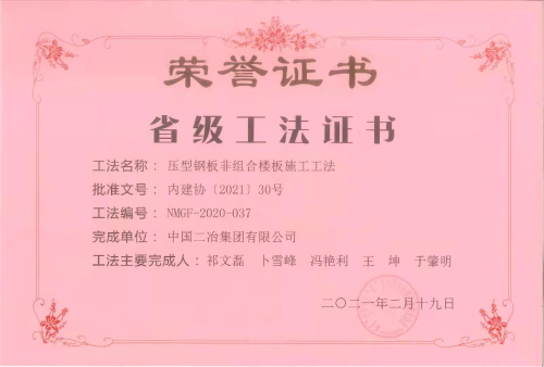 八項工法分別為市政分公司《靜態爆破施工工法》;鋼結構公司《大跨度焊接球網架地面拼裝整體提升施工工法》;路橋分公司《斜拉橋主塔交匯處鋼箱梁結構托架施工工法》;城建分公司《壓型鋼板非組合樓板施工工法》;管道分公司《管道深基坑支護綜合施工工法》;陜西分公司《單側支模條件下槽式預埋件安裝施工工法》;冶金分公司《高鐵站承軌鋼結構制作施工工法》及《彩色印花機組活套設備安裝施工工法》。