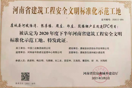 4月1日, 中國二冶鋼構(gòu)分公司承建的虞城棚改項目被河南省住房和城鄉(xiāng)建設(shè)廳評為 2020年下半年“省級建筑施工安全標(biāo)準(zhǔn)化示范工地”稱號 ,這是該項目部成立以來繼獲得商丘市“安全標(biāo)準(zhǔn)化示范工地”稱號后獲得的又一榮譽(yù),實現(xiàn)了該公司在中原地區(qū)省級安全文明施工獎項方面零的突破。