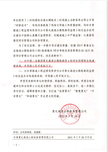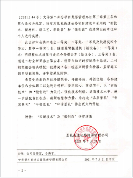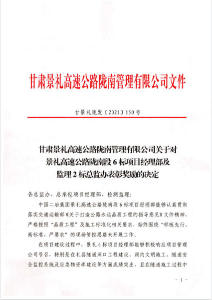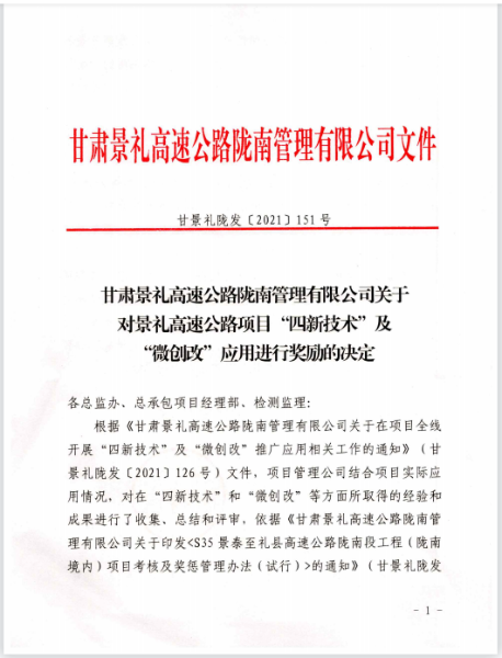 近日,甘肅分公司景禮項目部在甘肅景禮高速公路隴南管理有限公司組織的“四新技術”、“微創(chuàng)改”推廣應用、“品質工程”及施工標準化建設等檢查評比中名列前茅,項目管理公司對景禮項目部進行通報表揚,并給予獎勵40萬元。