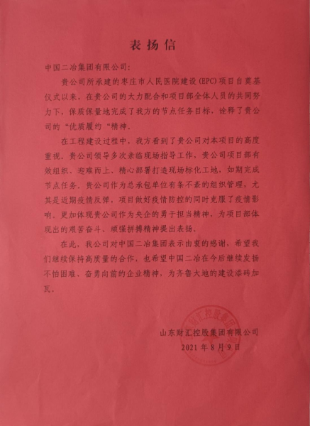 8月9日,中國二冶收到業主單位山東財匯控股集團有限公司的表揚信,來信對中國二冶集團科學組織、精心部署表示感謝,對棗莊人民醫院建設(EPC)項目當前的各項工作進展情況給予了高度贊揚。
