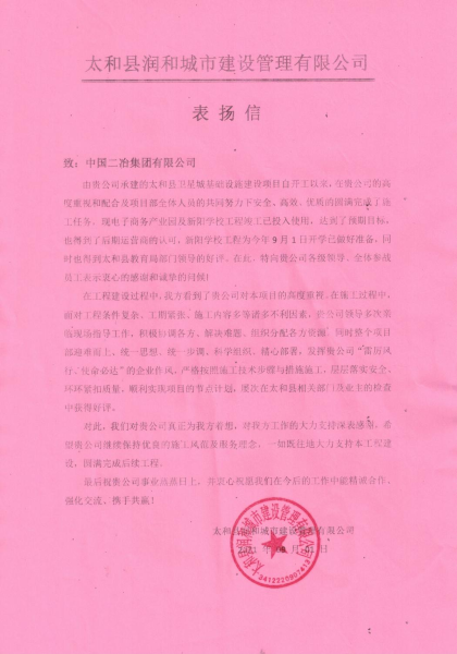 9月1日,中國(guó)二冶安徽太和衛(wèi)星城基礎(chǔ)設(shè)施建設(shè)項(xiàng)目部收到太和縣潤(rùn)和城市建設(shè)管理有限公司發(fā)來(lái)表?yè)P(yáng)信,同時(shí)向中國(guó)二冶各級(jí)領(lǐng)導(dǎo)、全體參戰(zhàn)員工表示衷心的感謝和誠(chéng)摯的問(wèn)候。