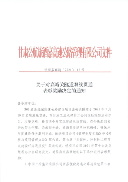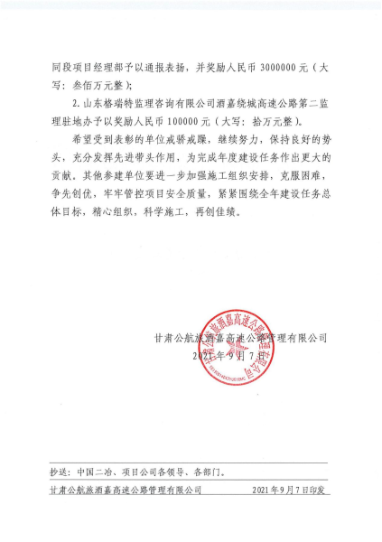 9月7日,甘肅公航旅酒嘉高速公路管理有限公司公發出通報,對在安全、質量、進度、廉政等方面取得優異成績的施工單位進行表彰,中國二冶酒嘉項目部榮登榜首,獲得獎金300萬元。