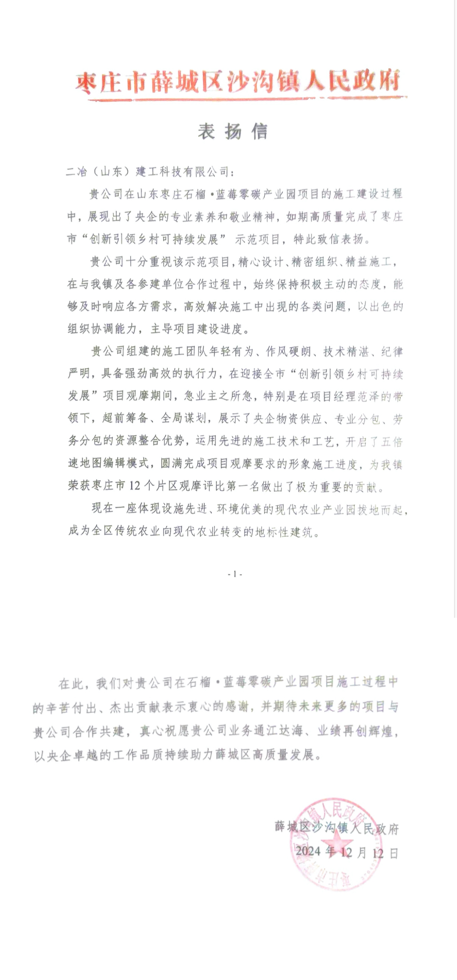 棗莊市薛城區(qū)沙溝鎮(zhèn)人民政府來信對二冶(山東)建工在棗莊石榴·藍(lán)莓零碳產(chǎn)業(yè)園項(xiàng)目施工中展現(xiàn)出的央企專業(yè)素養(yǎng)和敬業(yè)精神表示肯定,對項(xiàng)目在棗莊市12個片區(qū)觀摩評比中助力沙溝鎮(zhèn)榮獲第一名所作出的重要貢獻(xiàn)表示由衷感謝,對今后的合作共建寄予期望。棗莊石榴·藍(lán)莓零碳產(chǎn)業(yè)園項(xiàng)目作為推行國家鄉(xiāng)村振興戰(zhàn)略、國家數(shù)字化農(nóng)業(yè)戰(zhàn)略、綠色農(nóng)業(yè)、“雙碳” 戰(zhàn)略的示范項(xiàng)目,受到當(dāng)?shù)卣母叨戎匾暋m?xiàng)目團(tuán)隊(duì)秉承中國二冶雷厲風(fēng)行、使命必達(dá)的工作作風(fēng),以強(qiáng)勁硬朗的執(zhí)行能力高質(zhì)高效推進(jìn)項(xiàng)目建設(shè)進(jìn)度,為地方鄉(xiāng)村振興奉獻(xiàn)了央企智慧和力量。