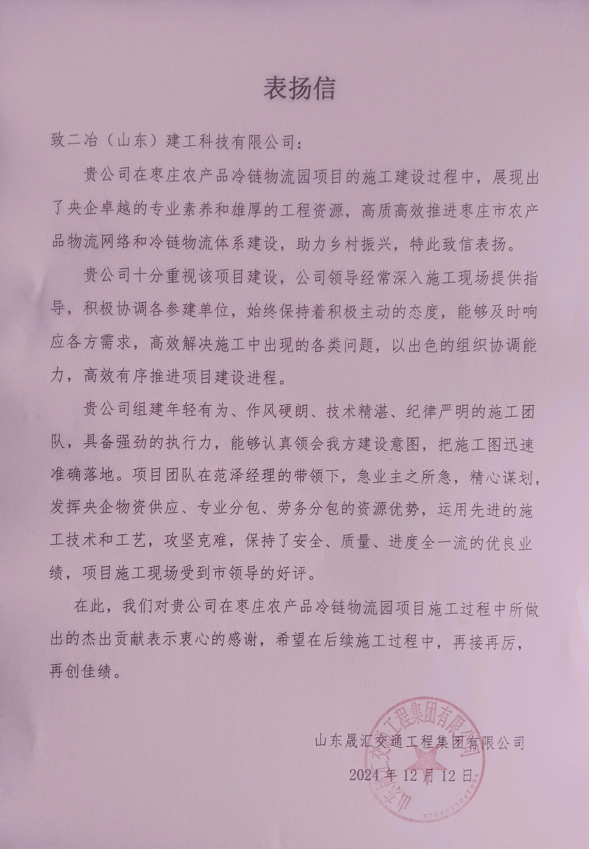 山東晟匯交通工程集團(tuán)有限公司來信表揚(yáng)二冶(山東)建工在棗莊農(nóng)產(chǎn)品冷鏈物流園項(xiàng)目建設(shè)中展現(xiàn)出的央企卓越專業(yè)素養(yǎng)和雄厚工程資源。棗莊農(nóng)產(chǎn)品冷鏈物流園項(xiàng)目是山東省物流發(fā)展戰(zhàn)略重點(diǎn)規(guī)劃建設(shè)項(xiàng)目之一,是棗莊市農(nóng)產(chǎn)品物流網(wǎng)絡(luò)和冷鏈物流體系建設(shè)重點(diǎn)項(xiàng)目,工期緊、任務(wù)重,建設(shè)中,山東公司領(lǐng)導(dǎo)深入施工現(xiàn)場,協(xié)調(diào)參建各方,形成共識,協(xié)同一致高效推進(jìn)項(xiàng)目進(jìn)度。項(xiàng)目團(tuán)隊(duì)嚴(yán)格執(zhí)行公司指令,攻堅(jiān)克難,用強(qiáng)勁的執(zhí)行力確保項(xiàng)目高質(zhì)量落地。歷時100多天的項(xiàng)目攻堅(jiān)戰(zhàn),項(xiàng)目團(tuán)隊(duì)成員的專業(yè)技能在實(shí)踐歷練中升華,團(tuán)隊(duì)協(xié)作在施工現(xiàn)場磨合中趨于默契,一支敢打硬仗的青年突擊隊(duì)在公司的精心培育下茁壯成長。項(xiàng)目團(tuán)隊(duì)在施工現(xiàn)場展現(xiàn)的央企風(fēng)貌得到項(xiàng)目參建各方的高度認(rèn)可和尊重。