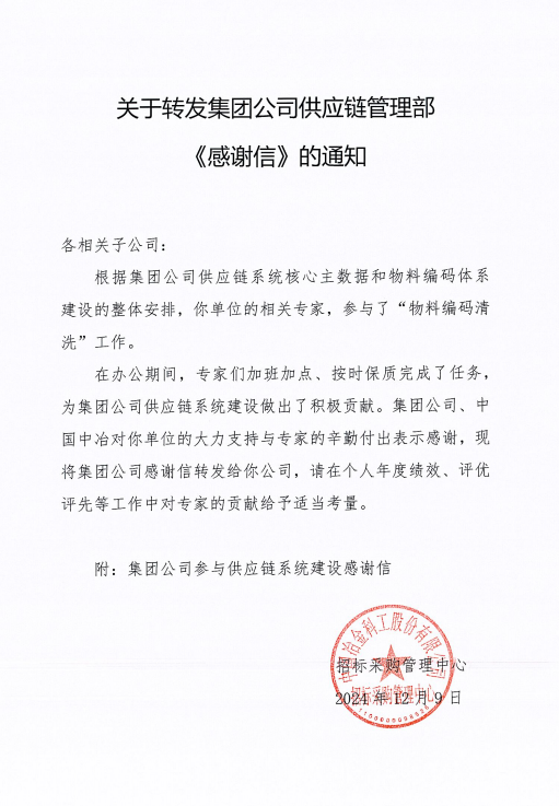 近日,公司收到中國五礦集團供應鏈管理部感謝信,對公司為中國五礦集團公司核心主數據建設做出的積極貢獻表示感謝。