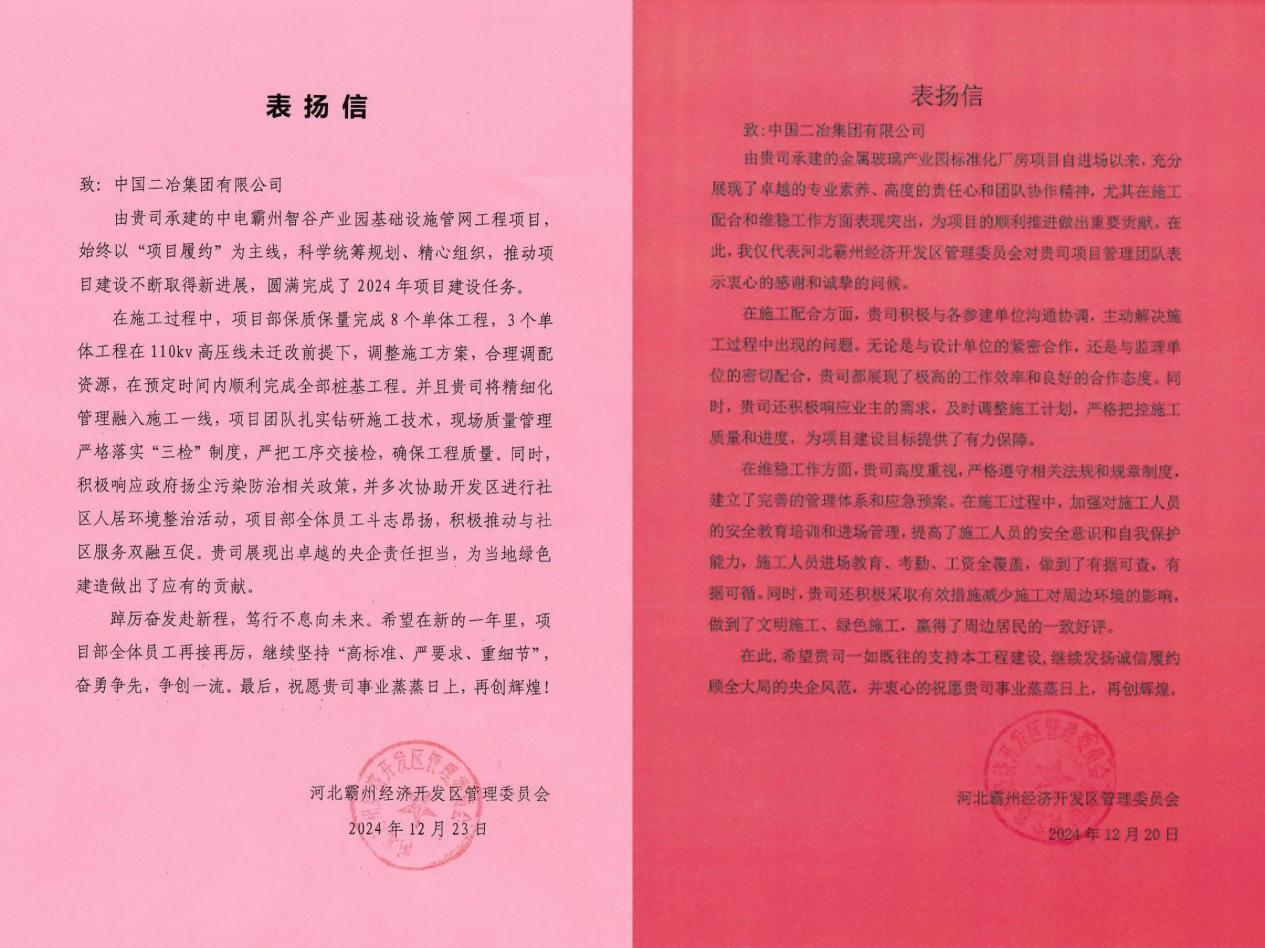 近日,中國二冶收到河北霸州經濟技術開發區管理委員會兩封表揚信。對霸州中電智谷項目部、金屬玻璃產業園標準化廠房項目部優質高效完成項目施工給予高度贊揚。