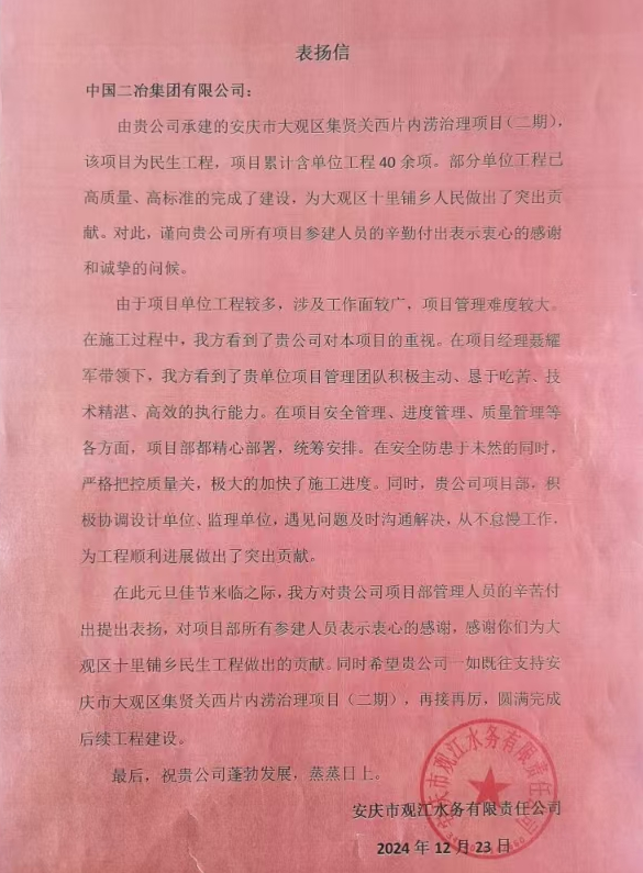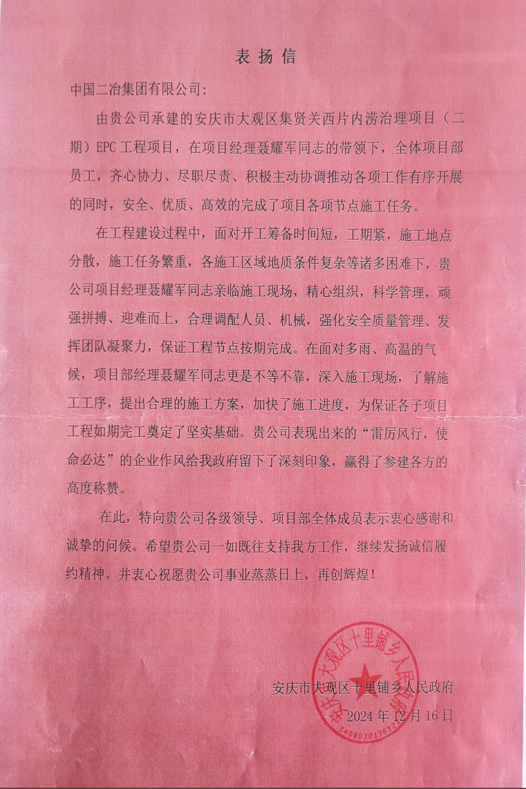 近日,安慶市大觀區十里鋪鄉人民政府和安慶市觀江水務有限責任公司給中國二冶發來表揚信,對安慶市大觀區集賢關西片內澇治理項目(二期)高質量、高標準完成施工任務給予高度贊揚。