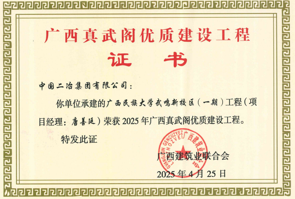 近日,廣西建筑業聯合會公布了2025年廣西建設工程“真武閣杯”獎(最高質量獎)工程名單,中國二冶廣西民族大學武鳴新校區(一期)工程榮獲此獎項。