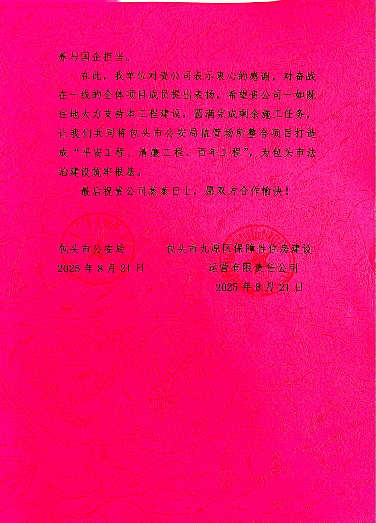 信中指出,貴公司作為總承包單位,充分發揮協調樞紐作用,高效對接設計、監理及分包單位,妥善解決現場技術爭議,使項目使用功能更加符合實際需求,確保工程高效推進。同時嚴格執行國家安全文明施工規范,全程“零事故”施工;對監區墻體結構、防逃設施等關鍵工序精益求精,質量達標,為包頭市的公共安全事業發展做出了重要貢獻。今年,在外網配套工程中標后,貴公司第一時間響應,相關領導高度重視,多次與我單位進行洽商會談,項目團隊迅速行動,人、材、機第一時間到位,形成了大干快上的良好局面,項目團隊展現的 “超越自我、挑戰極限”的作風,以及使命必達的執行力,深刻詮釋了專業素養與國企擔當。